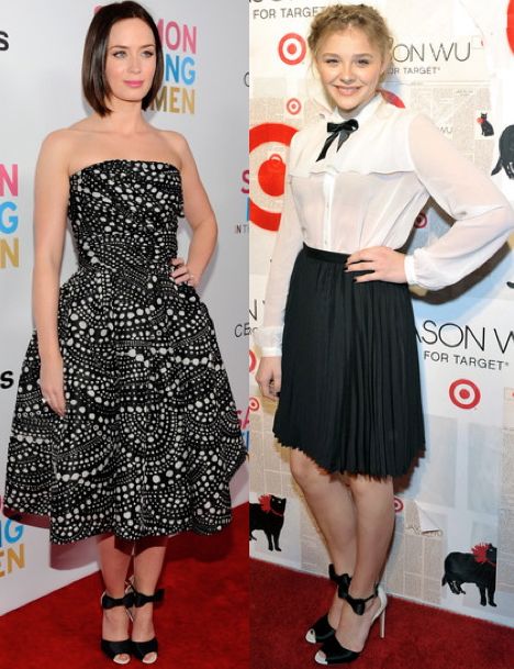 The clothes these two actresses are wearing couldn’t be more different, but all we are bothered about  in this fash-off is their shoes. Chloe Moretz was the first to sport these Gianvito Rossi Spring 2012 sandals in January, when she attended the Jason Wu for Target launch. Her black pleated skirt and white blouse with tie combo was a tuxedo-inspired look, so the bow tie design sandals finished off the outfit a treat.