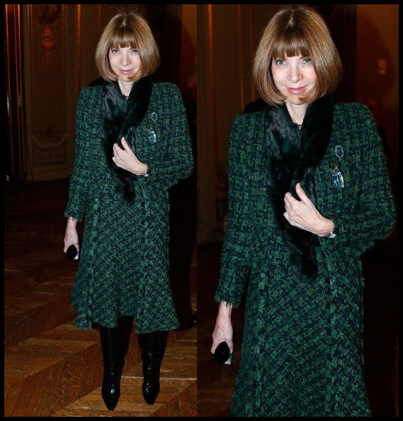 American Vogue Fashion Editor Anna Wintour, opted for a green tweed ensemble with some pointed black boots and a fur stole. Anna also sported her trademark bob hairstyle for the event.