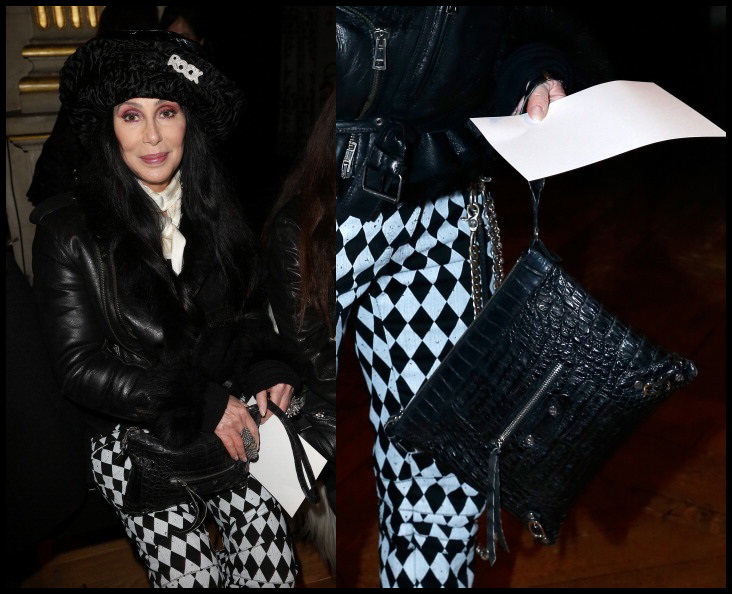 Singing sensation and Legend Cher was also seen at the event in a very large hat covering her long black hair with the word ‘Rock’ emblazoned on the front. Cher also wore a leather jacket with fur trim and a pair of monochrome trousers. She paired her look with a black crocodile print clutch bag and a statement ring.